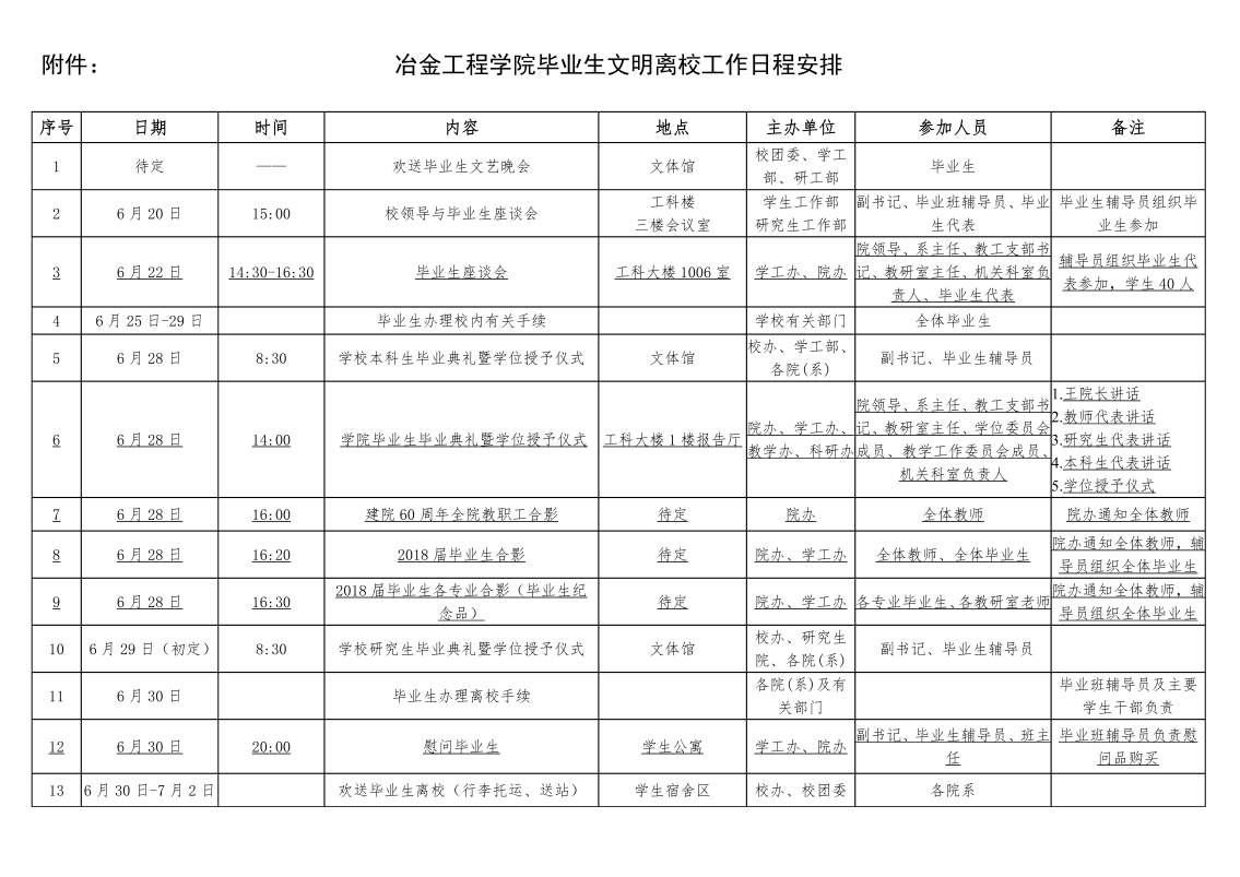 为确保毕业生文明离校工作顺利开展,发挥优秀毕业生的榜样作用,营造和谐、健康、文明的校园氛围,5月中旬,我院学生工作领导小组召开毕业生文明离校工作专题会议,安排部署2018届毕业生离校相关工作,在此基础上,制定了详细的实施方案,在毕业生离校前组织开展了丰富多彩、健康向上的毕业生文明离校系列活动。