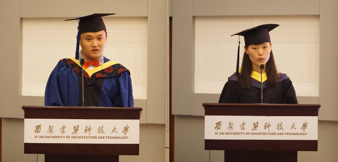 研究生代表王翀、本科生代表王琦代表毕业生发言,他们回忆了在建大学习生活的点点滴滴,对学校、学院的精心培养和老师们长期以来的辛勤付出表示感谢,并祝愿母校、学院明天更好。