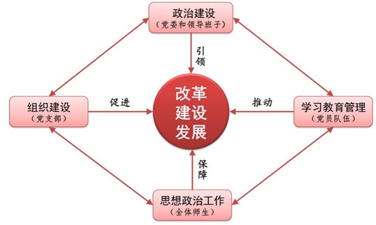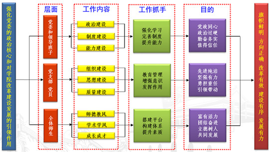 党委认真学习贯彻落实习近平新时代中国特色社会主义思想,以马克思主义系统观为指导,紧紧围绕党的政治建设、思想建设、组织建设、作风建设、纪律建设、制度建设,探索构建了“十二个一”党建工作体系,开展了一系列理论探索和实践活动。作为学校首批改革试点学院,学院党委清醒的认识到,如何围绕立德树人根本任务,发挥党组织在学院改革建设发展事业中的政治核心和引领作用,推动学院更好更快发展?这是摆在学院党委面前的首要任务。学院党委紧紧扭住综合改革试点工作这个抓手,始终聚焦如何推动学院更好更快发展这一关键问题,提出了围绕学院改革建设发展中心任务,重点在政治建设、组织建设、党员学习教育管理、思想政治工作四方面铺展党建工作的基本思路。与此同时,为有效解决基层党建工作中存在的“想干但不会干,会干但不善干”的现实问题,学院党委结合工作实际,确定了以“强化党委的政治核心和对学院改革建设发展的引领作用为出发点,以旗帜鲜明、方向正确、改革有效、建设有序、发展有力为落脚点,在领导班子、支部党员和全体师生三个层面推动党建工作”的实施路径,从宏观思路和具体路径两个维度对党建工作进行科学谋划和系统推进,为党建工作质量提升和学院内涵式发展奠定了坚实的基础。
