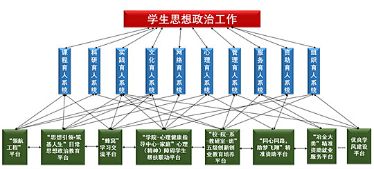 思想政治工作是高校党建工作中一项极为重要的政治任务,如何把“立德树人”根本任务落实在人才培养工作中,实现全员育人、全程育人、全方位育人,这是急需解决的难题。经过五年多的探索和实践,学院党委指导构建了“多位一体”学生思想政治工作体系,创建了“领航工程”“思想引领·筑基人生”“蜂窝”“同心同路·助梦飞翔”等10余个学生思想政治工作平台,建立了“紧紧围绕立德树人这个中心,建设一支素质高、作风硬、能力强的思想政治工作队伍,编印一本贯穿学生成长全周期、学生工作全覆盖的工作实用手册,构建多个彼此联系、相互支撑的工作平台”的“1+1+1+N”学生思想政治工作机制,极大提升了学生思想政治工作的科学化、系统化和规范化程度。五年多来,依托上述体系和平台,组织开展思想政治教育实践活动千余场,累计参与人数达7万余人次,实现学院学生全覆盖,取得了良好的育人效果。在实践的基础上,不断总结凝练,加强理论研究,积极推广成果。近五年,在思想政治工作研究领域,学院教师获准厅局级思政研究课题 3 项,校级课题 18 项,公开发表论文 37 篇,编写辅导员工作案例百余篇,成果获厅局级奖励 8 项,校级奖励 49 项,围绕“多位一体”学生思想政治工作体系,初步形成了“理论模型+工作手册+论文案例”的成果集。