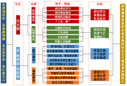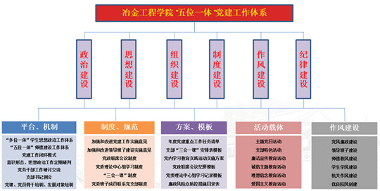 按照党的十九大提出的“全面推进党的政治建设、思想建设、组织建设、作风建设、纪律建设,把制度建设贯穿其中,深入推进反腐败斗争”党的建设总布局要求,学院党委充分吸收马克思主义哲学中系统论思想,结合学院党建工作实际,提出了“以党的政治建设为统领,以平台构建为切入点,以思想、组织、作风、纪律、制度建设为保障,以系统协同推进为工作路径,以推动党建工作内涵式发展和学院各项事业持续进步为总目标”党建体系构建思路,初步构建了“五位一体”党建工作体系。该体系由三个层次构成,顶层为全面提升党建工作质量这一总目标,中间层包含了党的政治建设、思想建设、组织建设、制度建设、作风建设、纪律建设六大任务,底层由平台机制建设、制度规范建设、方案模板制定、活动载体创建、作风建设五大模块组成,各个模块相互关联,各层次彼此支撑,从而形成了一个科学完备系统的工作体系。