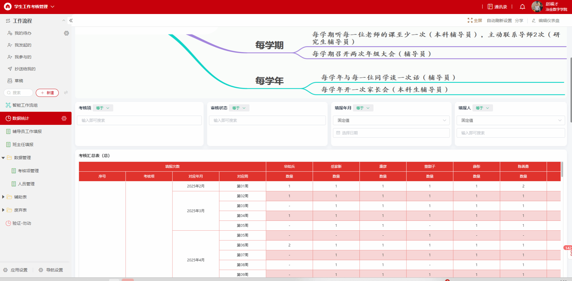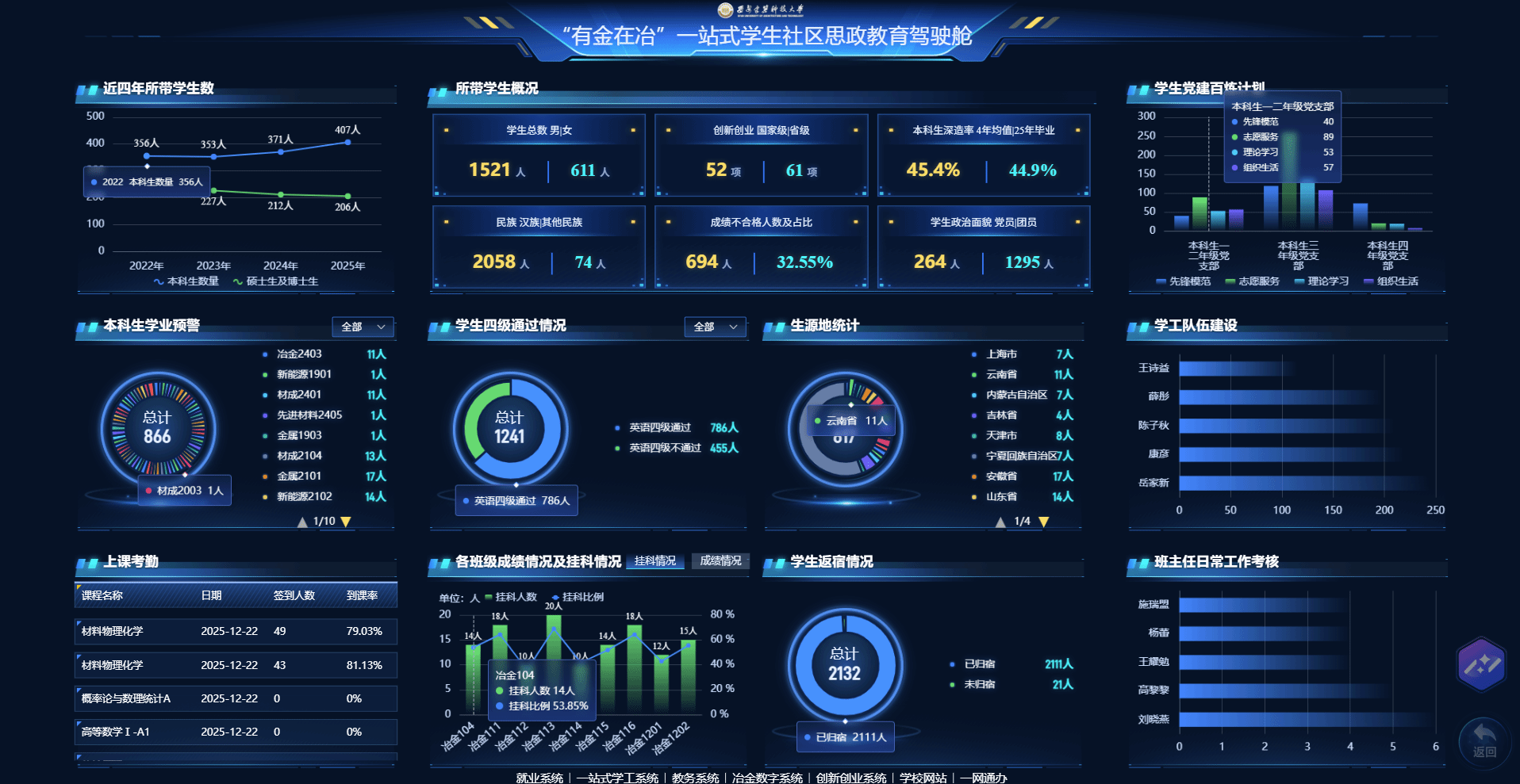 定制开发“有金在冶”“一站式”学生社区思政教育驾驶舱(//202.200.156.47:9000/xscreen/#/metallurgy)、学生党建“百炼”计划系统、学工工作管理与考核系统及班主任日常工作考核系统,是网信处锚定教育数字化转型战略方向、落实教育行政部门相关部署要求、纵深推进学校数智化工程建设的标杆性试点项目。系列系统的建设与应用,核心在于以数字赋能驱动思政育人模式创新变革,推动智能化技术与思政教育工作全方位、深层次、系统性深度融合,切实将立德树人根本任务落细落实,为构建高质量、现代化的学生思想政治教育体系提供坚实数字化支撑,全面赋能学院育人工作提质增效、提档升级。
