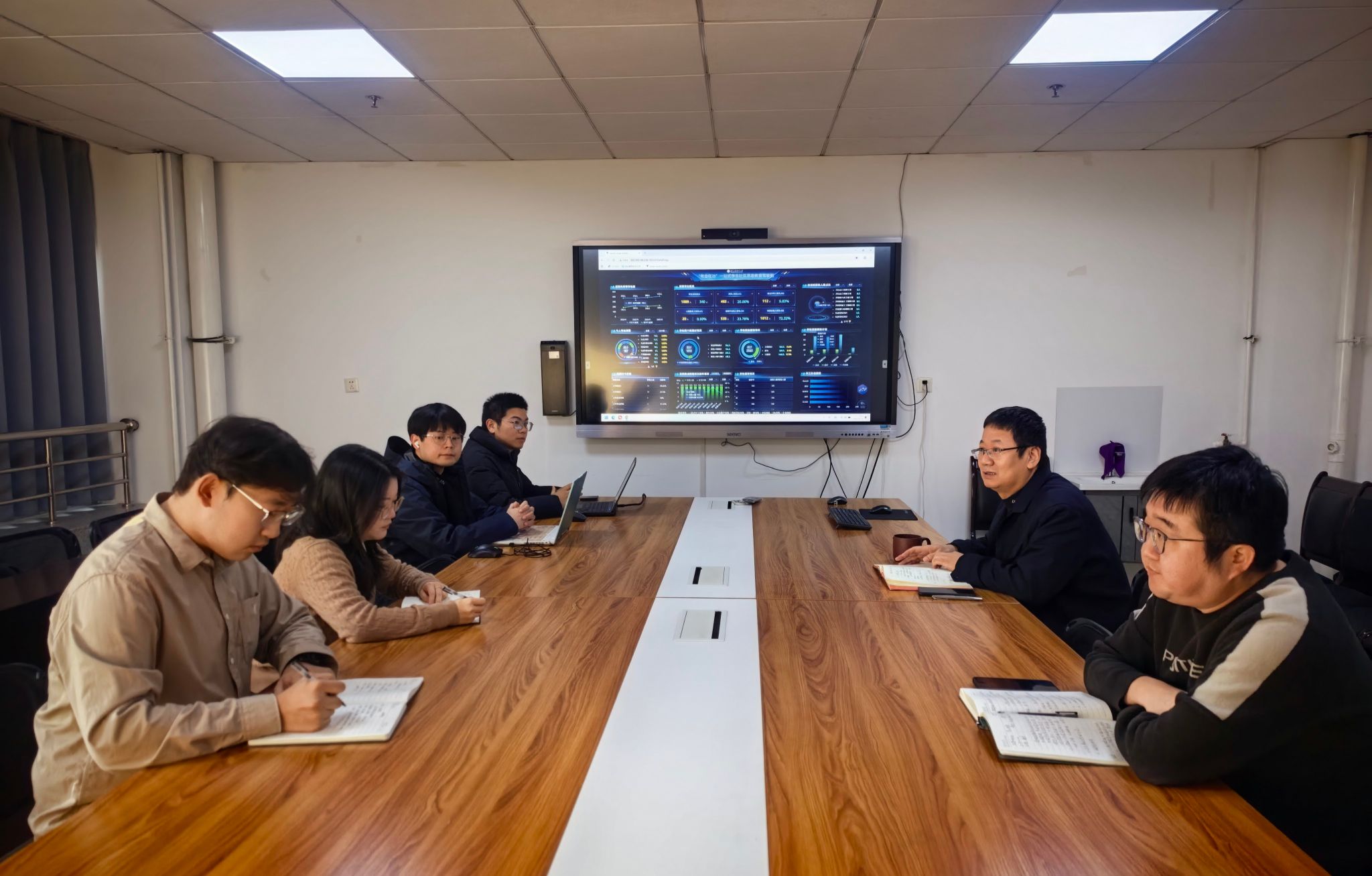 会上,各部门就驾驶舱大屏思政元素展示与联动、数据来源与接入、模块内容核对与完善、数据时效性及应用等内容展开深入交流。