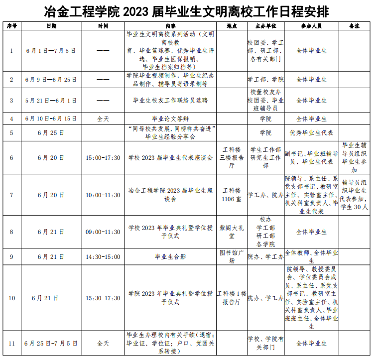 学生工作领导小组召开毕业生文明离校专题工作会议,安排部署2023届毕业生毕业离校相关工作,制定了详细的工作方案,组织了丰富多彩、健康向上的毕业生文明离校系列活动。