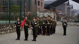 升旗仪式前,国旗卫队全体成员整装列队,肃穆而立,一切准备就绪。参加此次升旗活动的全体同学佩戴团徽,戴好口罩,排列成矩形方阵。随后,庄严而又充满希望的歌曲——《歌唱祖国》响起,旗手及国旗护卫队在歌曲声中正步走来,动作整齐划一,步履坚定自信。接下来,伴随着雄壮有力的国歌——《义勇军进行曲》,升旗手振臂一挥,鲜艳的五星红旗冉冉升起,全体同学满怀崇敬之情向国旗行注目礼,表达对祖国的崇高敬意。