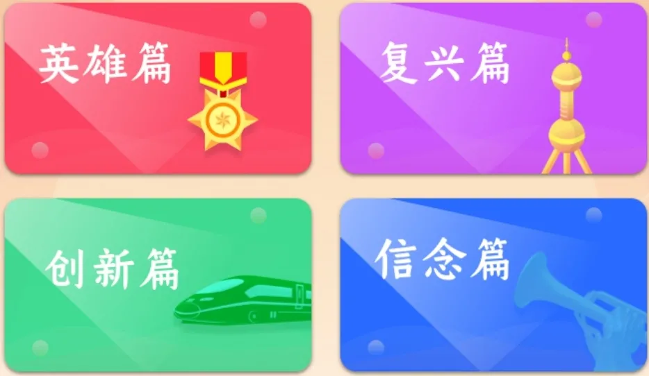1.每日答题:可选择“英雄篇”、“复兴篇”、“创新篇”及“信念篇”答题,系统随机出 20 道题,限时 10 分钟,每题 1 分,根据选手答对的题数进行积分,分数计入个人积分。