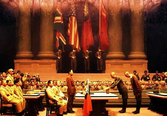 1945年9月2日上午,日本投降的签字仪式于停泊在东京湾的美国战列舰“密苏里”号上举行。当日9时4分,13年前在上海被炸断腿的日本新任外相重光葵和参谋总长梅津美治郎颤颤巍巍地登上这艘曾在硫磺岛、冲绳岛登陆战中威震一时的功勋战舰,而他们所能做的,只是代表日本政府在投降书上签字。9时8分,麦克阿瑟以盟国最高司令官的身份签字,接受日本投降,其余9个盟国代表包括中国代表徐永昌将军也都分别代表本国依次签字,整个过程不到十分钟。签字仪式结束后,上千架美军飞机越过“密苏里”号军舰、掠过东京湾上空,庆祝这一伟大历史时刻。至此,第二次世界大战以法西斯轴心国的失败和反法西斯同盟国的胜利而宣告结束。