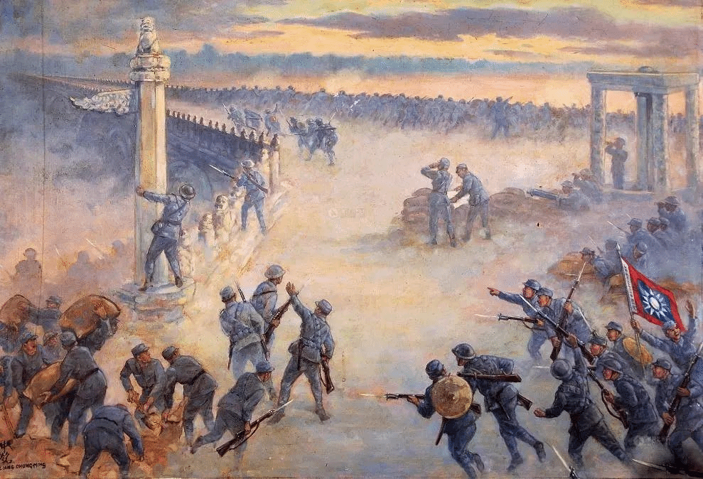 淞沪会战(又称八一三战役、第二次淞沪抗战,日本称为第二次上海事变),是中日双方在抗日战争中的第一场大型会战,也是整个中日战争中进行的规模最大、战斗最惨烈的一场战役。淞沪会战开始于1937年8月13日,是卢沟桥事变后,蒋介石为了把日军由北向南的入侵方向引导改变为由东向西,以利于长期作战,而在上海采取主动反击的战役。中日双方共有约100万军队投入战斗,战役本身持续了三个月,日军投入8个师团和2个旅团20万余人,宣布死伤4万余人;中国军队投入最精锐的中央教导总队及八十七师、八十八师及148个师和62个旅80余万人,自己统计死伤30万人。淞沪会战中日军因国民党的顽强抵抗而损失惨重,这场战役对于中国而言,标志两国之间不宣而战、全面战争的真正开始,卢沟桥事变后的地区性冲突升级为全面战争,并彻底粉碎了日本“三个月灭亡中国”的计划。国际法泰斗厉声教曾评价称:“淞沪会战为上海和长江下游工厂与物资内迁赢得了时间,为中国坚持长期抗战起到重大作用。”