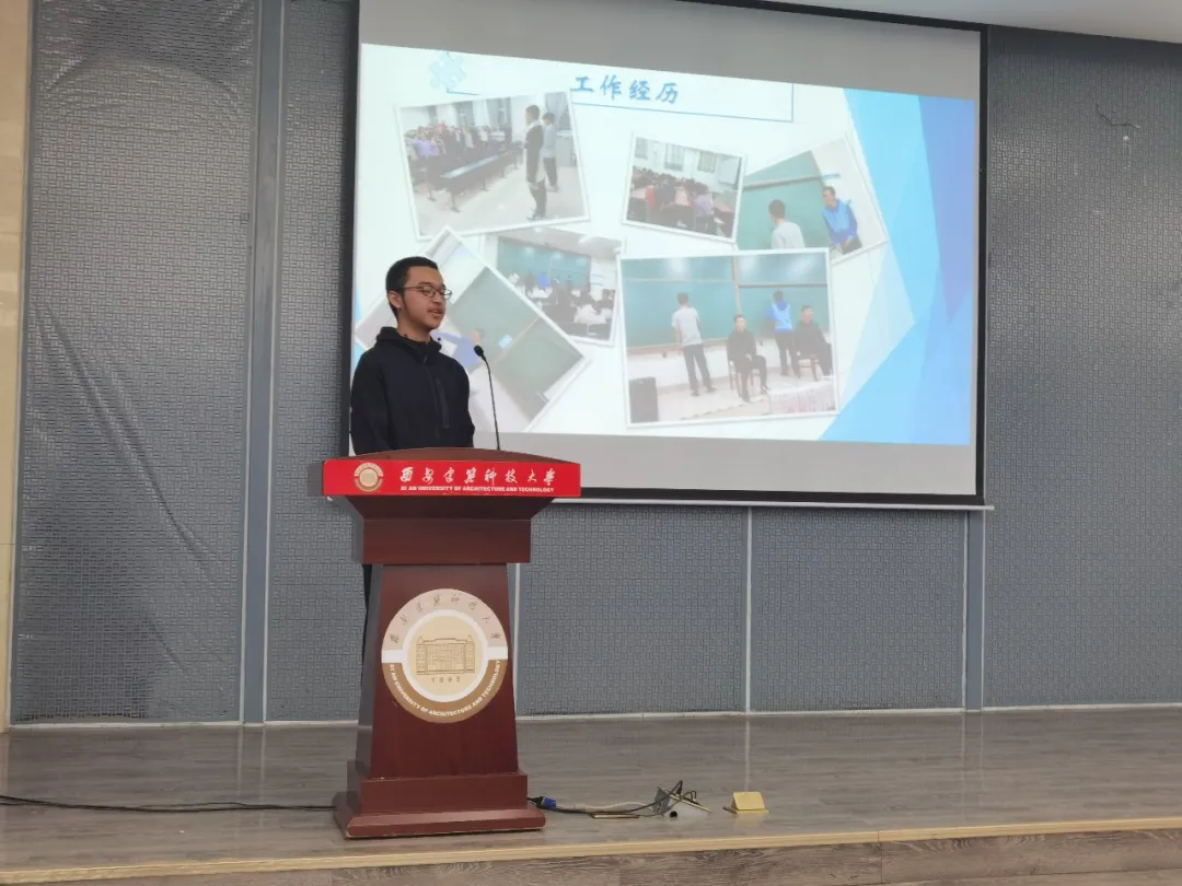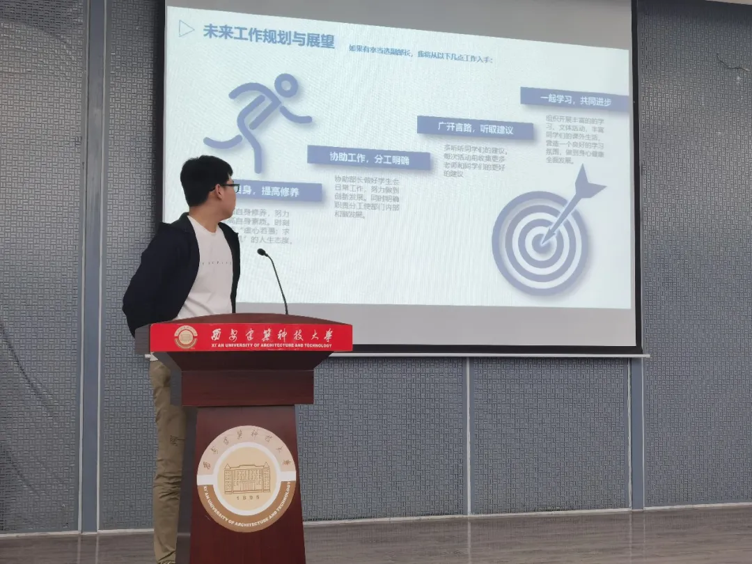 第一位选手是来自外联部的虞睿超,虞睿超选手身着正装,步履坚定地走上台,为答辩大会做了开头。做过自我介绍后,他从职位认识、工作经历和胜任理由三个方面展开答辩,PPT条理清晰,目标明确,声音洪亮,体现出了他对工作的重视和热爱。