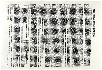 1935年8月1日,中共驻共产国际代表团草拟了《八一宣言》,响亮地提出“抗日救国”的口号,号召“有钱的出钱,有枪的出枪,有粮的出粮,有力的出力,有专门技能的贡献专门技能”,并进一步提出建立“全国统一的国防政府”,组织“全国统一的抗日联军”等。宣言呼吁全国各党派、各军队、各界同胞都应以“兄弟阋于墙,外御其侮”的真诚觉悟,“停止内战,以便集中一切国力去为抗日救国的神圣事业而奋斗”。