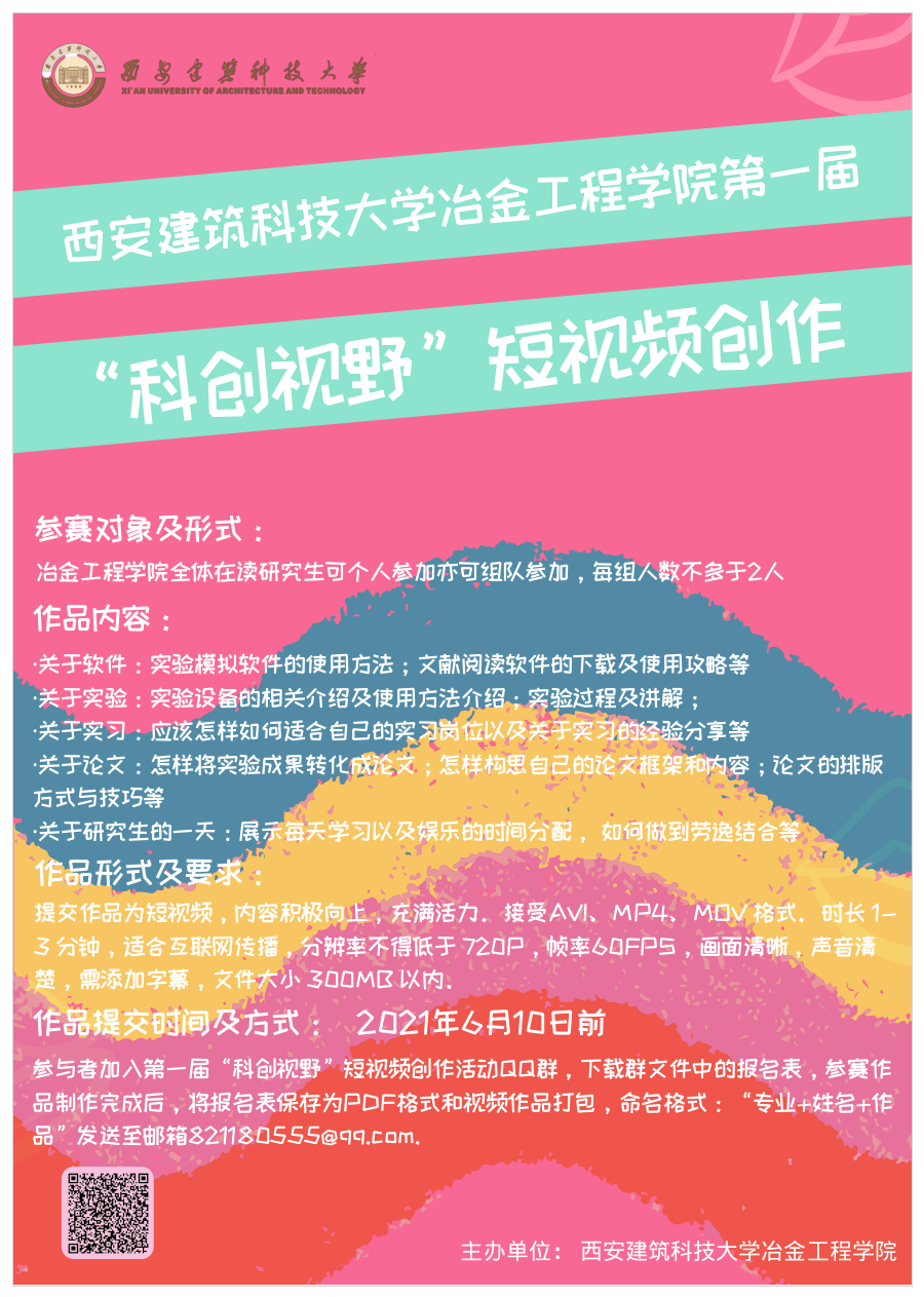 (2)参与者填写《西安建筑科技大学科创视野短视频报名表》(“阅读原文”提取,提取码:kcsy),报名表请保存为pdf格式,按规定格式进行短视频制作,最后将短视频作品和报名表整理成压缩包,并以“姓名-班级-作品名-联系电话”命名发送至邮箱[email protected];参赛作品提交后,参与者需申请加入“第一届科创视野短视频创作活动”QQ群。