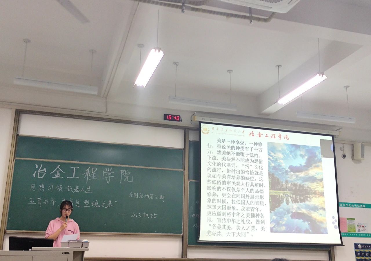 讲座最后,主持人播放了有关冶金青年积极开展美育工作的相关活动视频如军训歌唱比赛、迎新晚会,展现出独属“小金人”的艺术美。