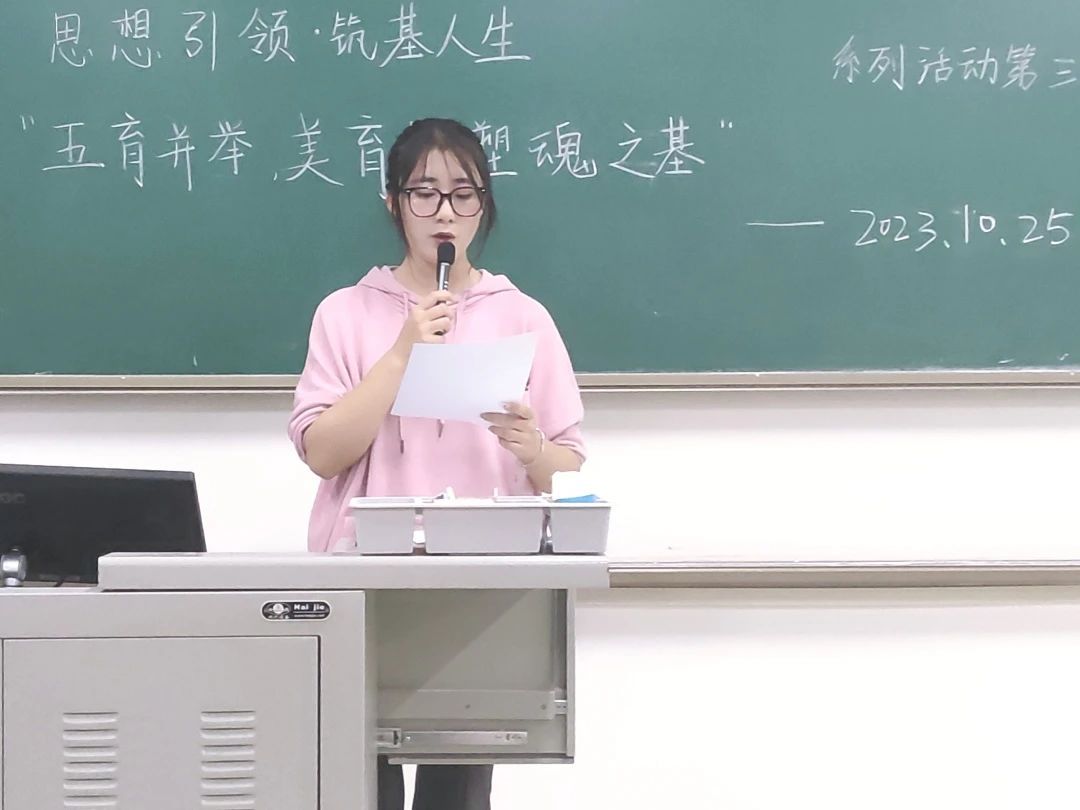 讲座第二项,主持人引述了人民日报发表的时评“美育是一种刚需,为美而献身,比为面包而活着更加幸福。”希望同学们可以拥有发现美的眼睛,能够善于在生活中找到美,从而制造美。接下来主持人陈述了美育教育,让同学们明白美育教育有利于陶冶人的情操,使人的心灵得以净化;美育教育有利于培养新时代各方面人才,提高思维的多元化。