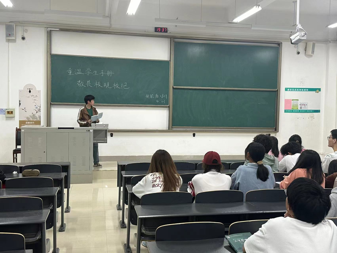 23级各班成功举办了以“遵规守纪促学风”为主题的特色班会。此次活动响应学院“遵规守纪促学风”专题活动。各班学生积极参与,各班班长组织全体学生重温一次学生手册,敬畏每一条校规校纪,强化一次考风考纪教育,开展一次廉洁教育,学习大学生行为规范和《中华人民共和国网络安全法》,解读一次社会公德和社会主义核心价值观,教育引导全体学生遵守校规校纪,受警醒、明底线、知敬畏。