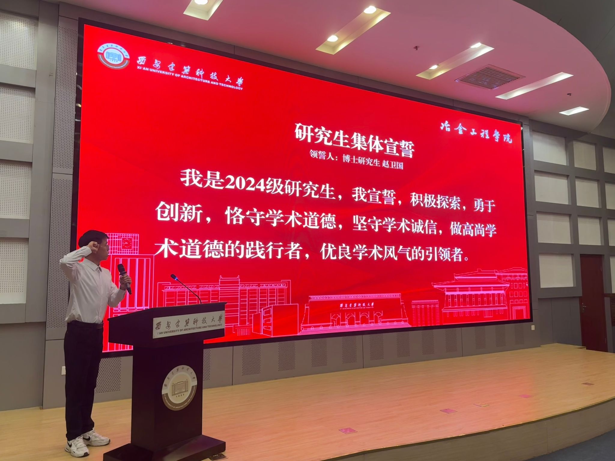 2024级博士研究生赵卫国作为领誓人带领2024级研究生宣誓:我是2024级研究生,我宣誓,积极探索,勇于创新,恪守学术道德,坚守学术诚信,做高尚学术道德的践行者,优良学术风气的引领者。